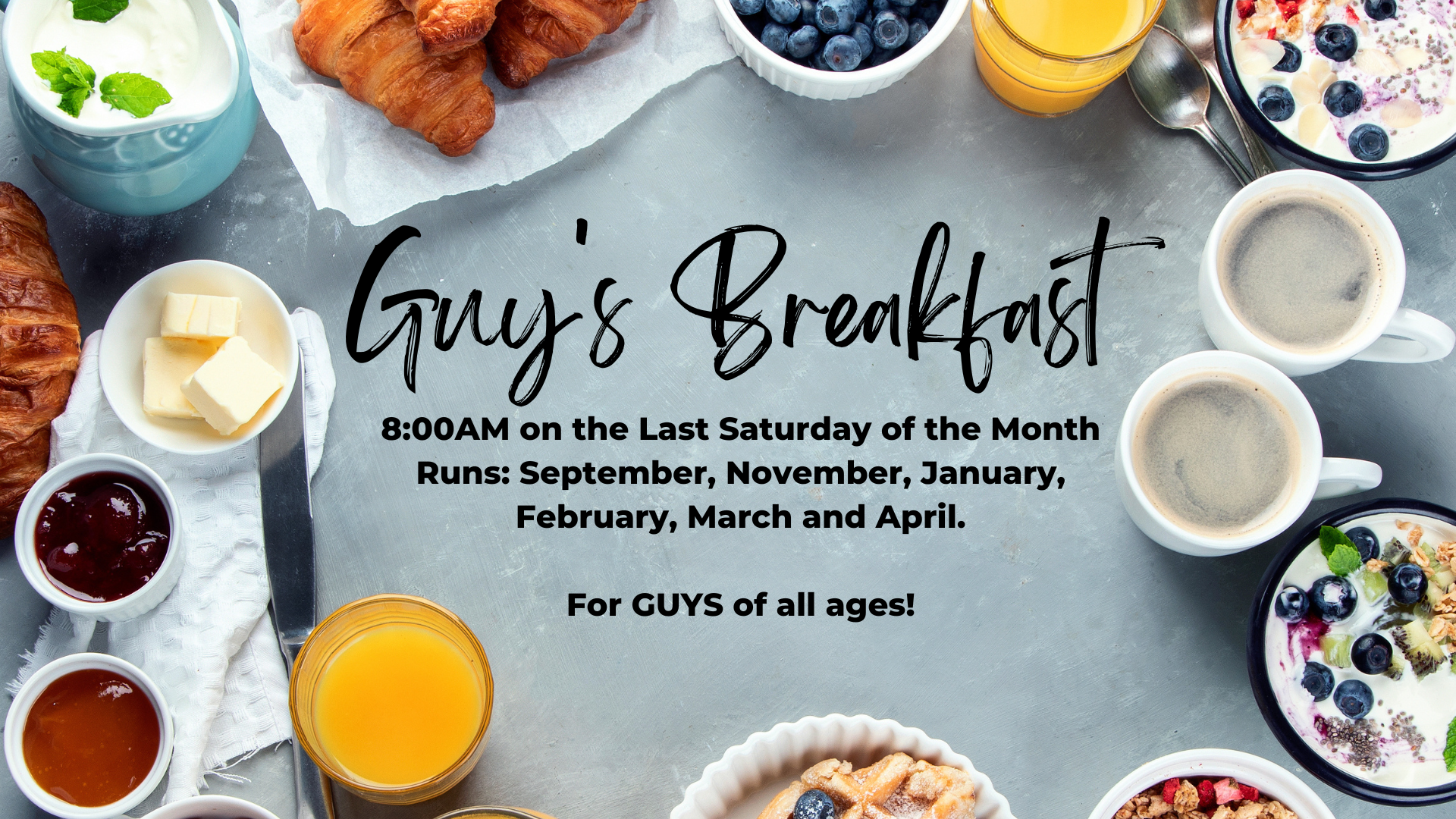 Guys of all ages are welcome to join us for breakfast on the last Saturday of the month (not during the summer months) at 8:00am in the gym. Each month we will have a special speaker share some insights with us, and fellowship together while enjoying a delicious breakfast. Invite a friend and come join us!